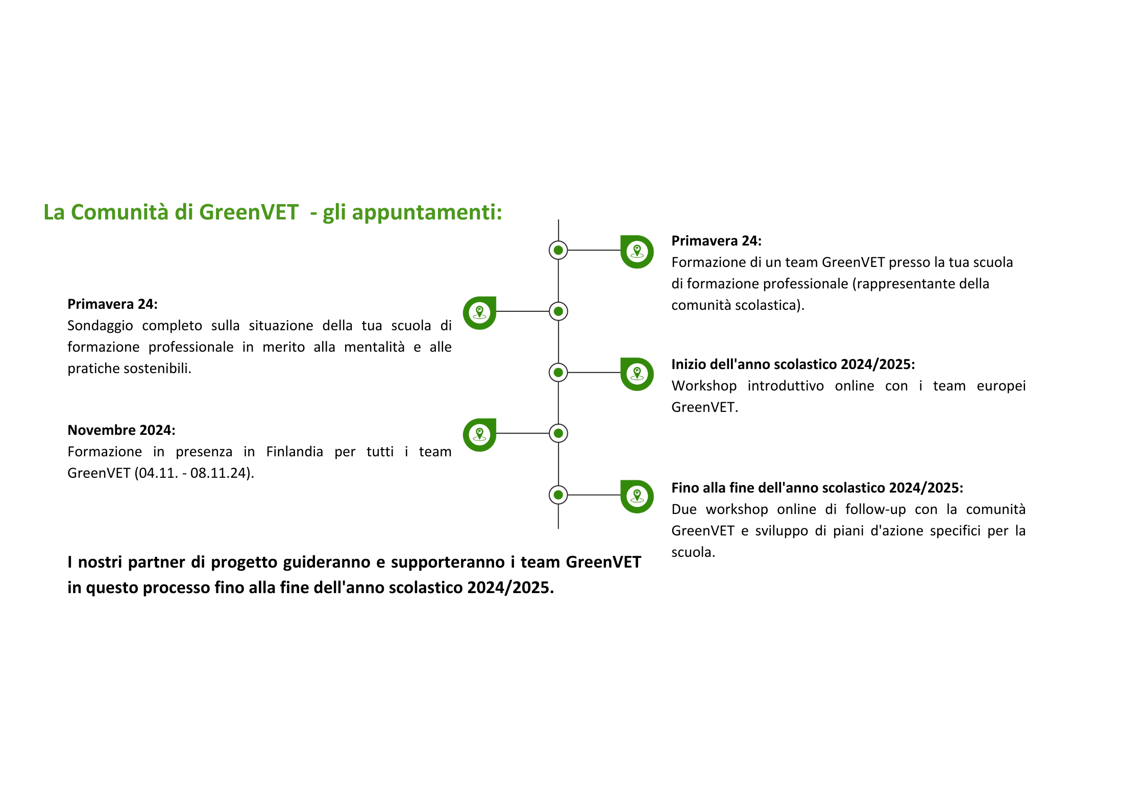 Il partenariato del progetto Erasmus+ GreenVET mira a sostenere le scuole IFP di tutta Europa a svolgere un ruolo cruciale nella creazione e promozione di una cultura della sostenibilità. Rivolgendosi all'istituzione in modo olistico, le scuole IFP partecipanti hanno l'opportunità di esplorare il potenziale delle loro istituzioni e la formazione che forniscono per la transizione verde.