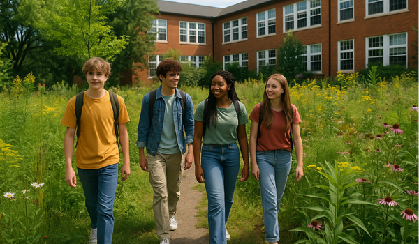 I campus rinaturalizzati trasformano gli spazi verdi sottoutilizzati o gestiti in modo intensivo in aree naturali che ripristinano l'equilibrio ecologico e sostengono la biodiversità. Questi spazi creano opportunità per riconnettersi con la natura e migliorano il valore ambientale complessivo del complesso scolastico.
