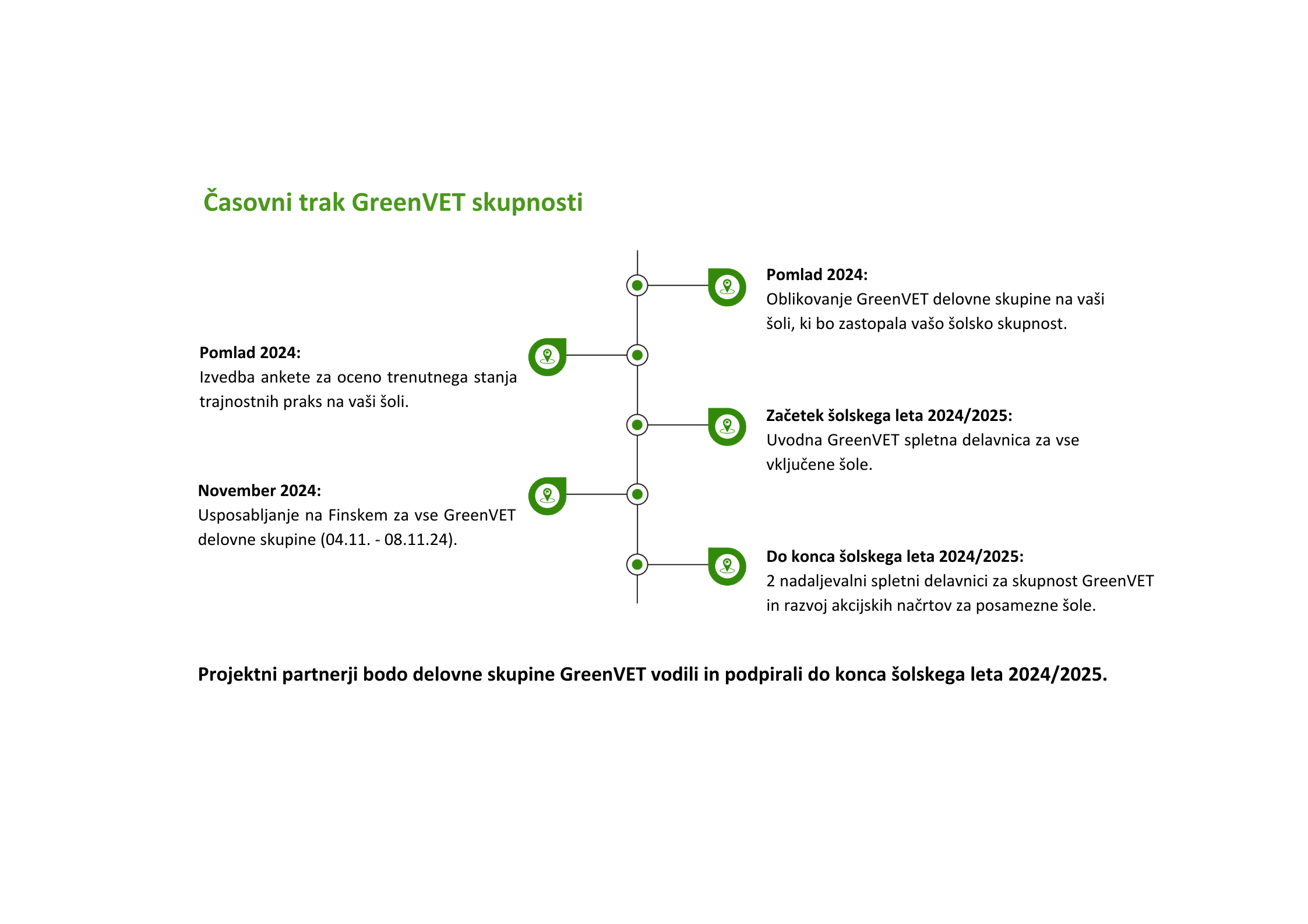 V okviru projekta bomo oblikovali GreenVET skupnost sodelujočih šol poklicnega izobraževanja in usposabljanja s Cipra, Finske, Nemčije, Grčije, Italije, Latvije in Slovenije. Projektni partnerji bodo podpirali skupnost z možnostmi za čezmejno usposabljanje in usmerjali šole poklicnega izobraževanja in usposabljanja s pristopom celotne institucije k trajnosti.